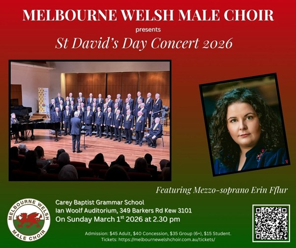The Melbourne Welsh Male Voice Choir is proud to present our 2026 St David’s Day Concert in celebration of the Welsh National Day.